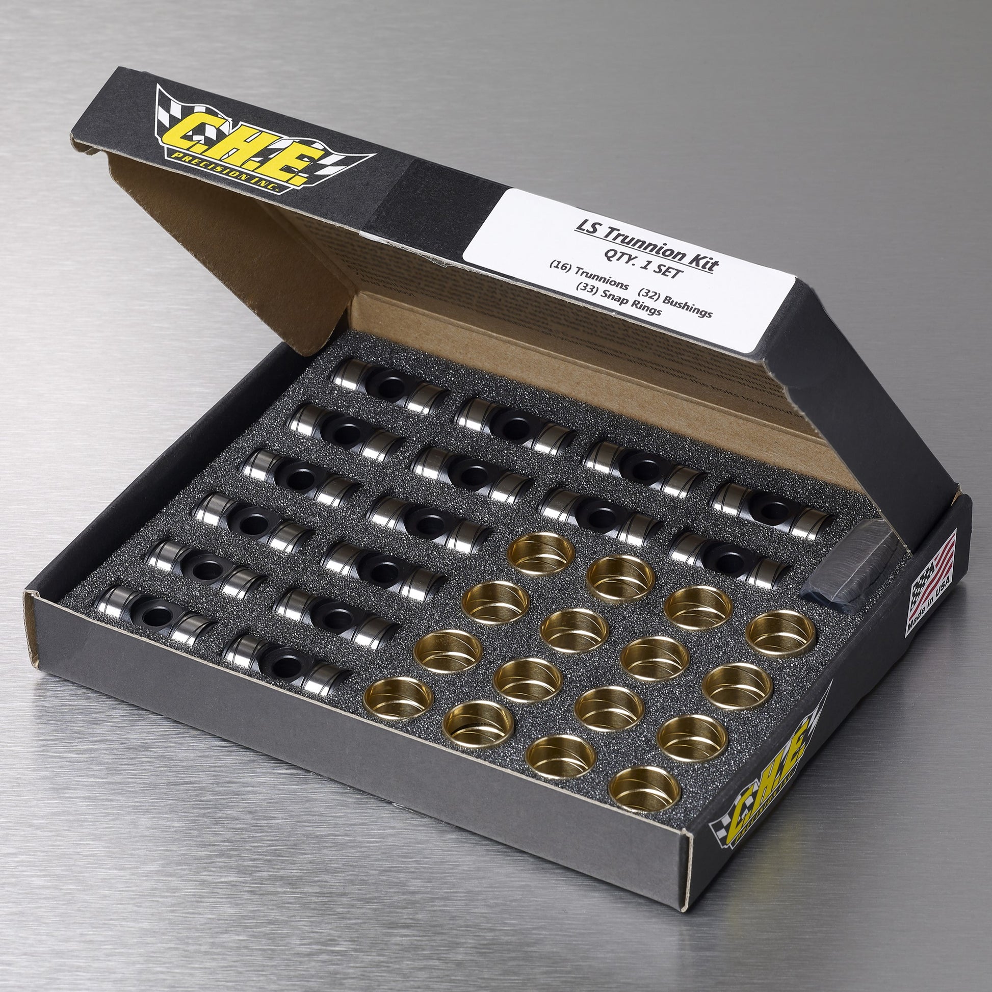 The CHE Trunnion Kit is compatible with both stock and aftermarket rocker bolts, and installs easily using only snap ring pliers and assembly lubricant. Each kit includes 16 hardened steel trunnions, 32 bronze bushings, and 32 retainer clips.